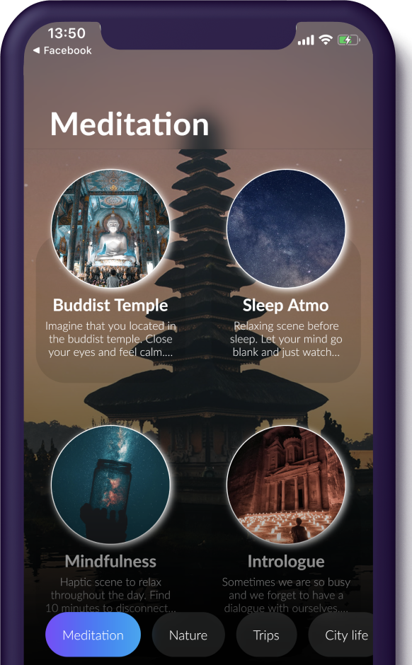 Feel sound and calming vibration with Vibrator Zen RealFeel haptics scene generator. Imagine you can close your eyes and be somewhere else, somewhere pleasant place to be. Audio-haptic experience will help you to achieve this feeling.